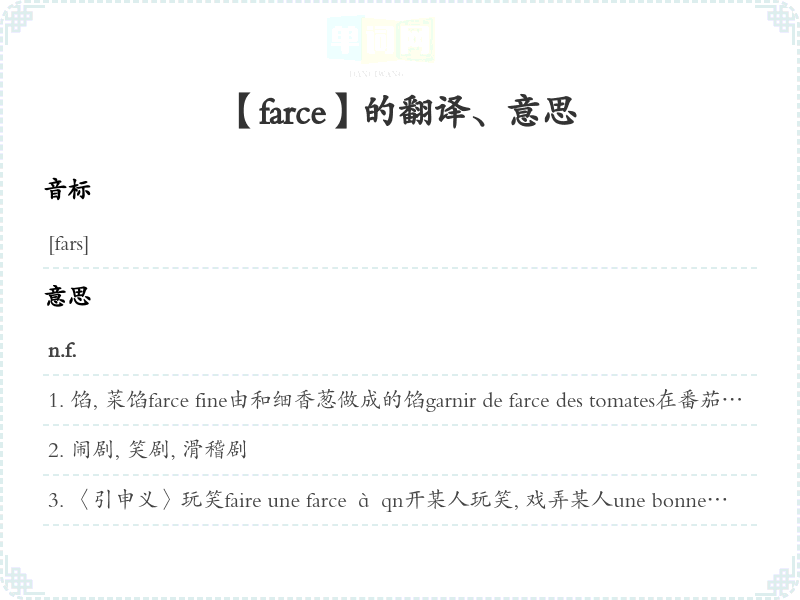 〈引申义〉玩笑faire une farce à qn开某人玩笑, 戏弄某人une bonne farce 成功的玩笑une mauvaise farce 恶作剧être le dindon de la farce 成为戏弄的对象— a.〈旧语,旧义〉〈口语〉滑稽的, 好笑的gestes farces引人发笑的动作