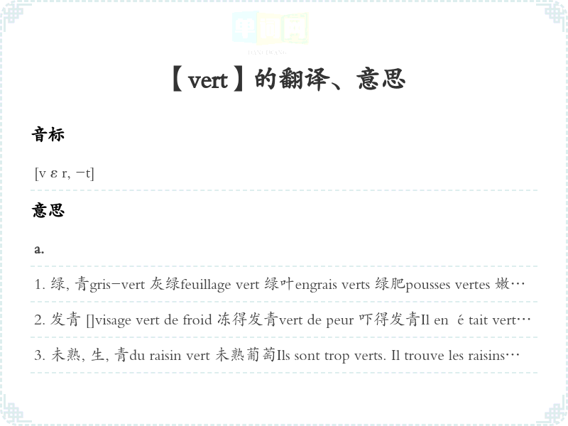 〈比喻〉未加工, 未经处理, 还不能使用café vert 生咖啡cuir vert 【制革】血皮, 湿皮vin vert 未酿熟尚带酸味酒morue verte 腌鳕鱼