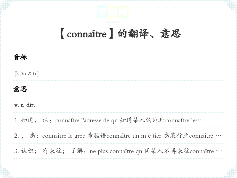 , 悉:connaître le grec 希腊语connaître un métier 悉某行业connaître un texte par cœur 记一篇课文connaître la musique [转, 俗]心中有数, 知道这是怎么回事Il ne connaît pas grand-chose à l'aviation. 他对航空方面并不知道多少西。