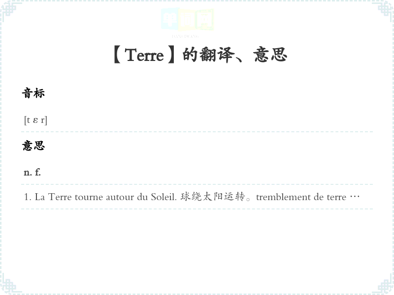 【Terre】 词源:、 词根:、 派生:、 联想、 近义词、 同音、近音词 联想词