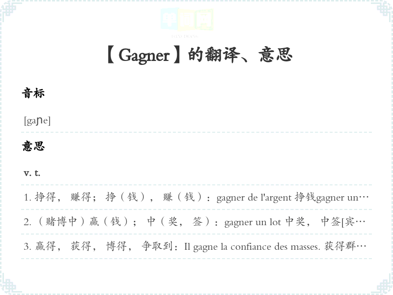 赢得, 获得, 博得, 争取到:Il gagne la confiance des masses. 获得群众的信任。 gagner l'estime de qn 博得某人的尊重L'enfant a gagné plusieurs kilos. 这个孩子重了几公斤。 gagner du temps 赢得时间性, 争取到时间, 节约时间Prenez ce raccourci, vous gagnerez un bon quart d'heure. 抄这条近路吧, 你可以足足省掉一刻钟。