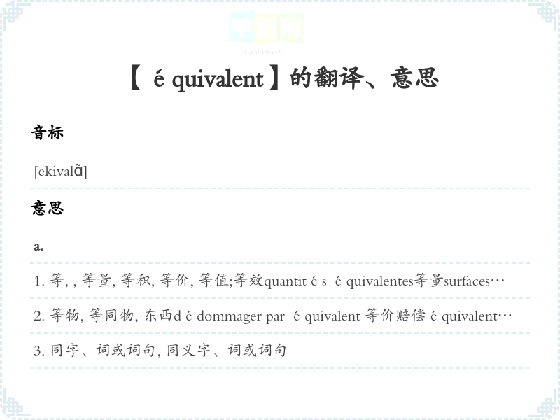 等, , 等量, 等积, 等价, 等值;等效quantités équivalentes等量surfaces équivalentes等面积volumes équivalents等体积figures équivalentes等积图形projection équivalente等(面)积投影équations équivalentes【数学】等价方程Ces deux expressions sont équivalentes.这两种表达方式是等同。— n.m.
