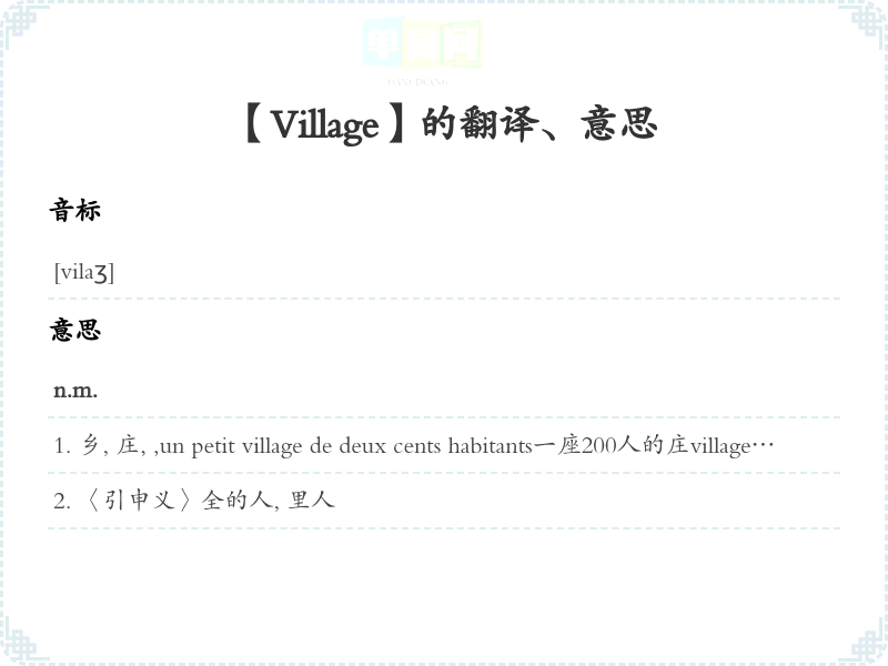 乡, 庄, ,un petit village de deux cents habitants一座200人的庄village olympique奥林匹克village club, village -club乡俱乐部village de montagne山village de toile(勘探队等的)帐篷village de vacances, village -vacances度假être bien de son village 〈转义〉还很幼稚;还没有见过世面