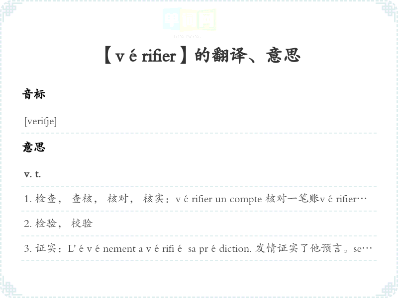 检查, 查核, 核对, 核实:vérifier un compte 核对一笔账vérifier une nouvelle 核实一条消息