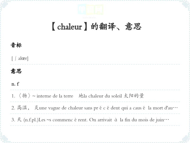 【chaleur】 助:、 词根:、 派生:、 形容词变化:、 副词变化:、 近义词:、 反义词: 联想词