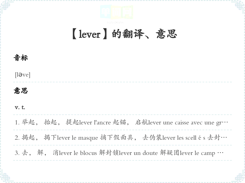 去, 解, 消lever le blocus 解封锁lever un doute 解疑团lever le camp 拔营; [转]离开, 逃跑lever une interdiction 取消禁令lever les obstacles 排障碍lever la séance 宣布散lever la sentinelle 哨兵lever le siège 围; [转, 俗]走开, 离去