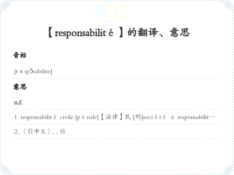 responsabilité civile [pénale]【法律】民 [刑]société à responsabilité limitée有限()公司 [缩写为S. A. R. L.]accepter une responsabilité 承担一个prendre la responsabilité d'une affaire负起一的avoir la responsabilité de对…负有faire qch. sous sa (propre) responsabilité 负做某