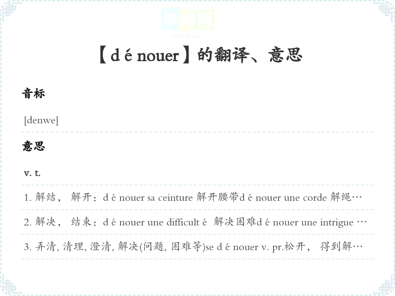 弄清, 清理, 澄清, 解决(问题, 困难等)se dénouer v. pr.松开, 得到解决:Ses cheveux se sont dénoués. 她的头发松开了。