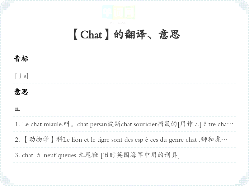 Le chat miaule.叫。chat persan波斯chat souricier捕鼠的[用作 a.]être chatte很柔媚 [指女性]langue de chat 〈口语〉舌 [种长条形小饼干]œil de chat 儿眼, 眼石saut de chat 【舞蹈】跳 [蜷腿侧跳]toilette de chat 马马虎虎的梳洗打扮acheter chat en poche〈旧语,旧义〉不货, 闭着眼睛买东西appeler un chat un chat 直言不讳avoir d'autres chats à fouetter有更重要的事要做avoir un chat dans la gorge喉咙发毛C'est de la bouillie pour les chats.这是徒劳无益的事情。这是难以理解的事情。donner sa langue au chat 自认猜不来écrire comme un chat 字写得很难认être [vivre] comme chien et chat 相处不睦, 相互仇视être gourmand comme un chat 样嘴馋éveiller le chat qui dort旧事重提;自找麻烦Il n'y a pas de quoi fouetter un chat .这是小过失。没有什么了不起的事。jouer au chat et à la souris互相找来找去找不着Il n'y a pas un chat .个人影儿没有。À bon chat bon rat.棋逢敌手。Chat, te échaudé craint l'eau froide.开水烫过的怕冷水。日被蛇咬, 十年怕井绳。La nuit tous les chats sont gris.夜里的都是灰色的。黑夜里难以别。Quand le chat n'est pas là, les souris dansent.儿不在, 耗子跳舞。