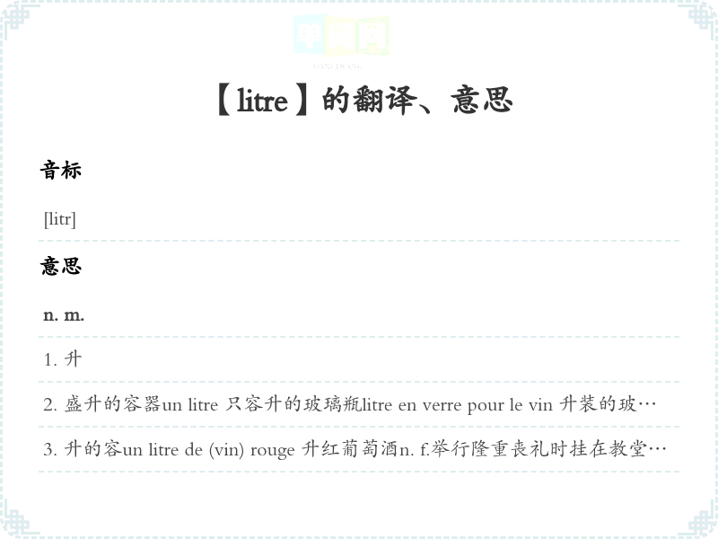 升的容un litre de (vin) rouge 升红葡萄酒n. f.举行隆重丧礼时挂在教堂周围的丧帷