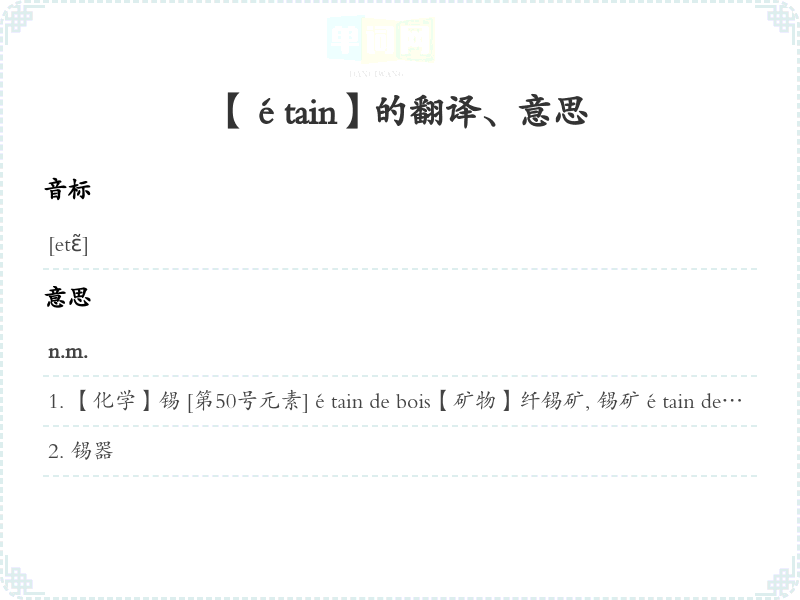 【化学】锡 [第50号元素]étain de bois【矿物】纤锡矿, 锡矿étain de glace铋旧名maladie de l'étain 【冶金】锡疫, 锡病papier d'étain 锡纸