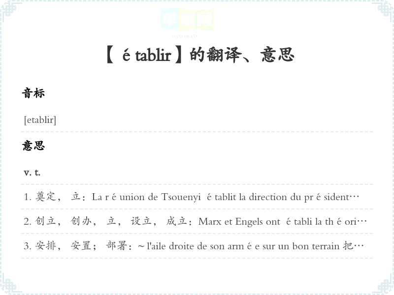 【établir】 派生:、 形容词变化:、 名词变化:、 近义词:、 反义词: 联想词