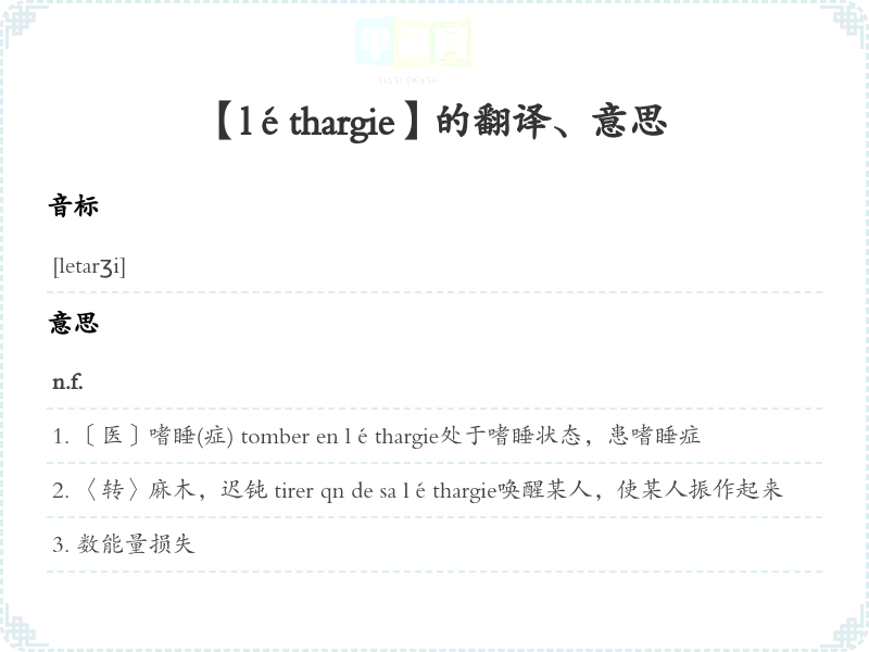 〔医〕嗜睡(症) tomber en léthargie处于嗜睡状态,患嗜睡症