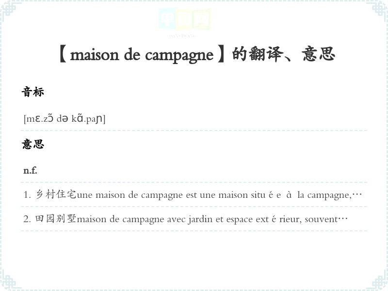 【maison de campagne】 助记:、 词根:、 联想、 名词化:、 词化:、 形容词化:、 近义词、 反义词、 同音、近音词 联想词