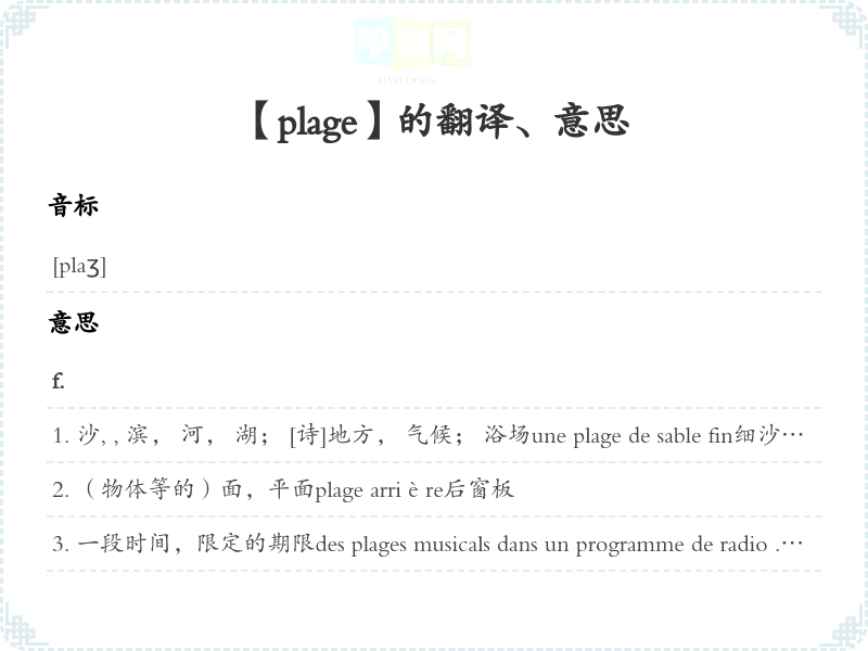 【plage】 词源:、 联想:、 名词变化:、 近义词: 联想词