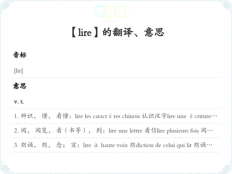 阅, 阅览, 看(书等), 到:lire une lettre 看信lire plusieurs fois 阅几遍lire l'anglais 阅英语lire en diagonale [俗]匆匆浏览, 一目十行地阅signer sans lire 不过目就签字se faire lire 拥有量者[指一个]ouvrage qui se laisser lire 容易阅的品; 使人爱的品livre qui mérite d'être lu 值得一的书lire un auteur étranger dans le texte 阅一位外国的原文lire entre les lignes 从字里行间看出J'ai lu dans le journal que … 已从报纸上到 …
