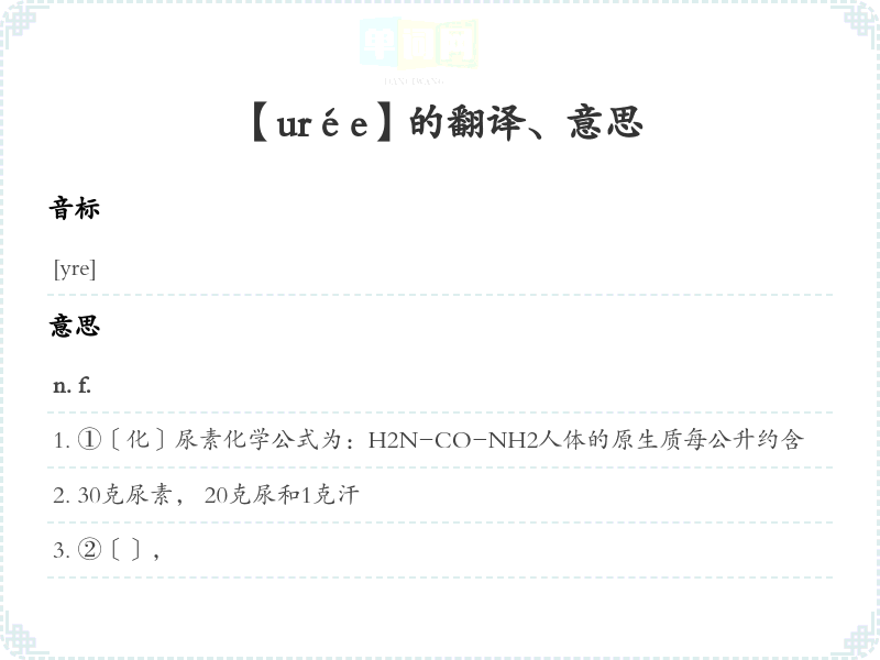 ①〔化〕尿素化学公式为:H2N-CO-NH2人体的原生质每公升约含
