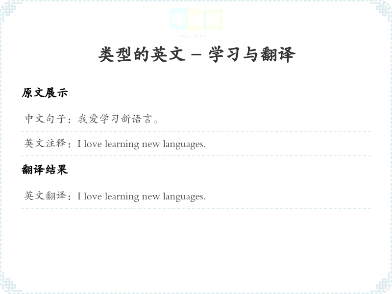 通过本篇文章的学习,希望你能够对"我爱学习新语言。"这个词的翻译及相关用法有一个全面的理解,并在实际应用中灵活运用。