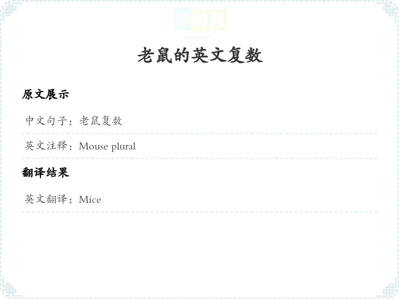 - 在中文中,'老鼠'的复数形式是'老鼠们',在英文中,它的复数形式是'mice',这是一个不规则变化。翻译时需要注意这种特殊情况。
