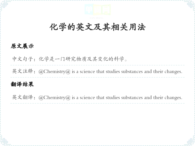 英文注释: @Chemistry@ is a science that studies substances and their changes.
