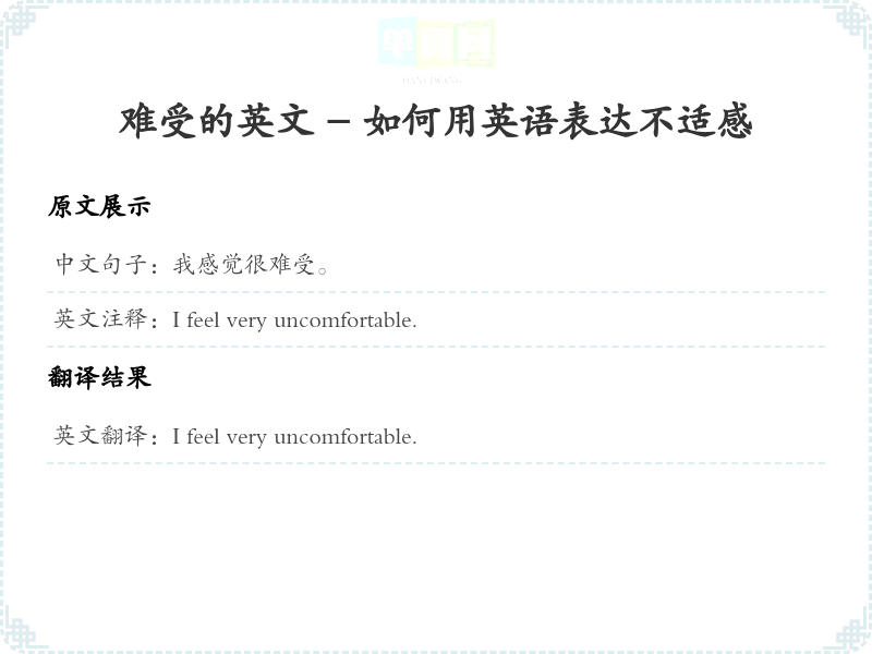 - 在翻译过程中,关键是准确传达情感及身体状态。‘难受’可翻译为‘uncomfortable’,意指身体或心理的不适感。使用‘feel’作为动词,能够清晰表达主语的状态。