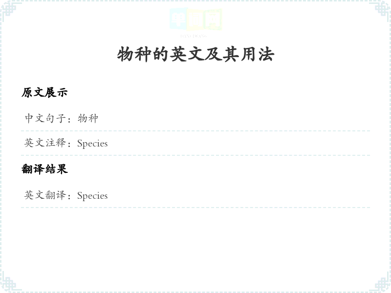 - 在翻译过程中,'物种'直接对应于英文中的'species',这是生物分类学中常用的术语,指的是具有共同特征和能够相互繁殖的一组生物。