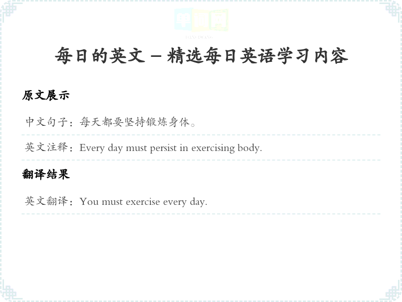 通过本篇文章的学习,希望你能够对"每天都要坚持锻炼身体。"这个词的翻译及相关用法有一个全面的理解,并在实际应用中灵活运用。