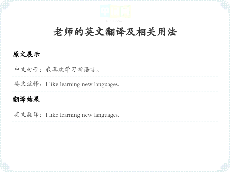 通过本篇文章的学习,希望你能够对"我喜欢学习新语言。"这个词的翻译及相关用法有一个全面的理解,并在实际应用中灵活运用。