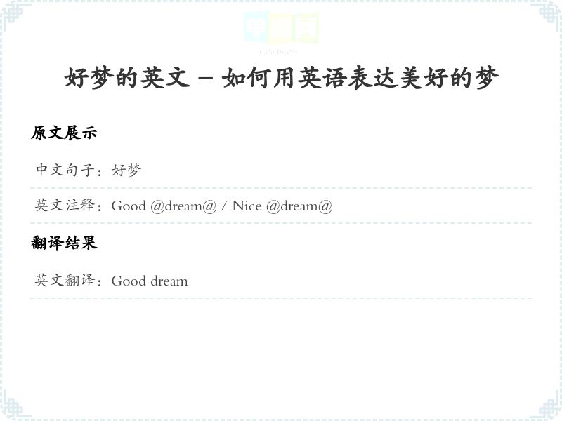 - 在翻译过程中,'好梦'被理解为一个常用的祝福语,表示对他人美好梦境的祝愿。‘好’在这里表示美好,而‘梦’则是梦境的意思,因此直译为‘Good dream’。
