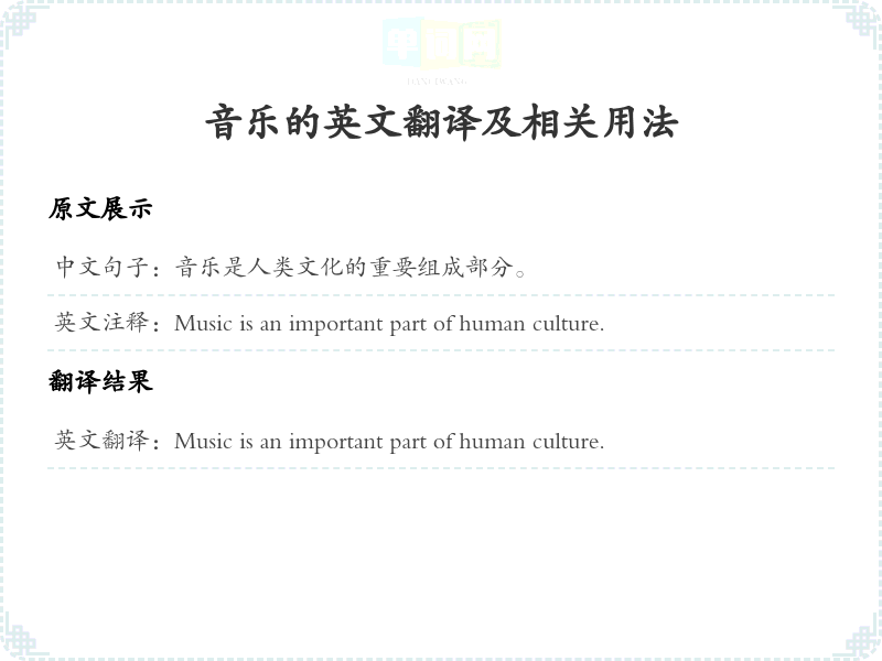 通过本篇文章的学习,希望你能够对"音乐是人类文化的重要组成部分。"这个词的翻译及相关用法有一个全面的理解,并在实际应用中灵活运用。