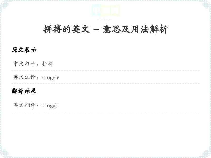 通过本篇文章的学习,希望你能够对"拼搏"这个词的翻译及相关用法有一个全面的理解,并在实际应用中灵活运用。