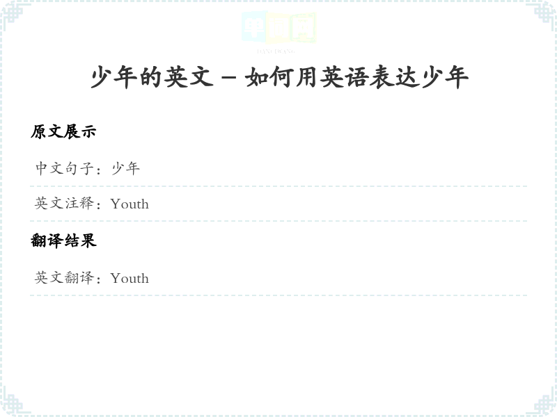 - 在翻译时,选择了最贴切的词汇来表达中文中的含义。'少年'在英语中通常被翻译为'youth',它既可以指代年轻人,也可以表示青春期的阶段。