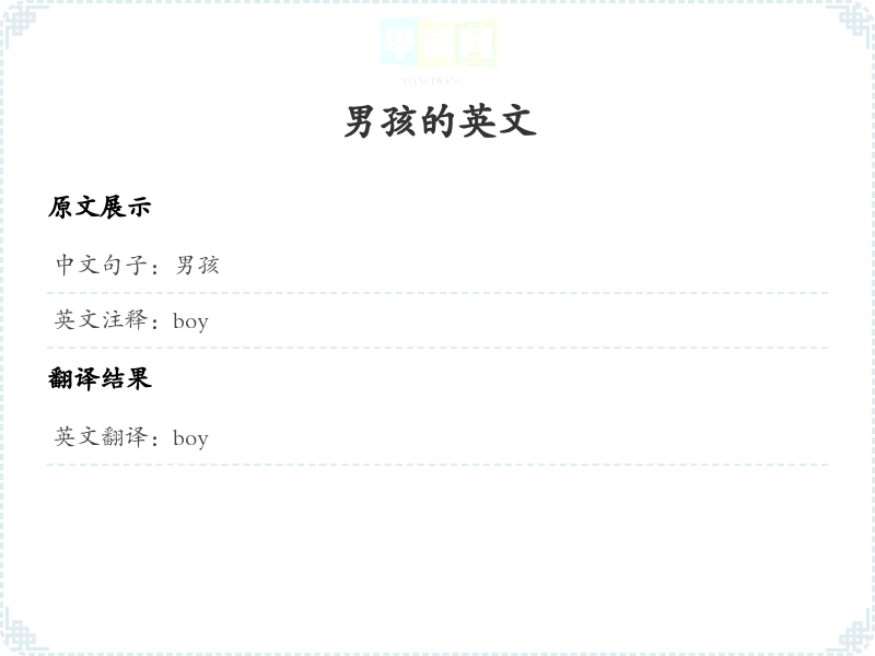 在翻译过程中,选择了最常见的英文单词 'boy' 来对应中文的 '男孩',因为 'boy' 在英语中是指年轻男性,与中文含义完全一致。