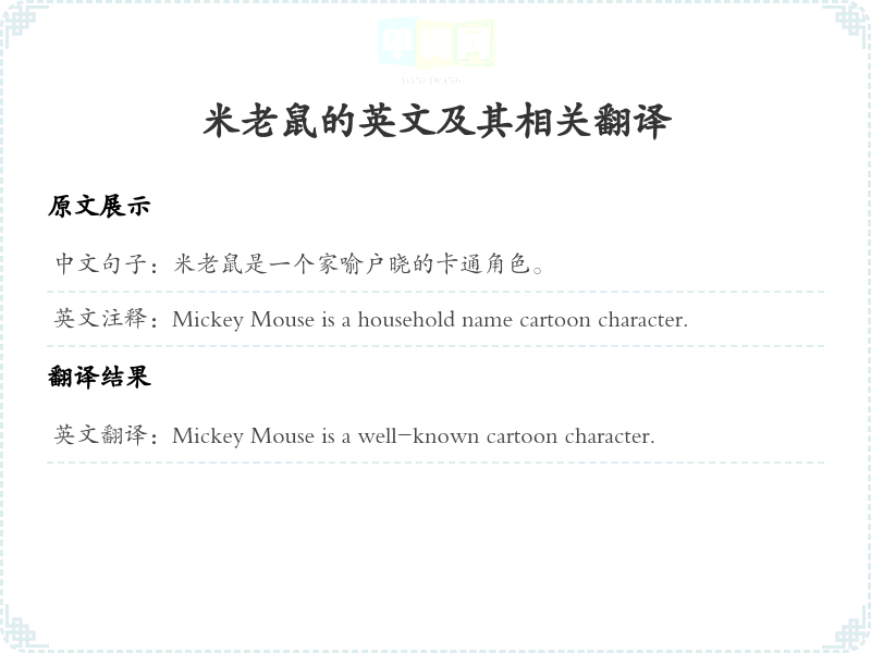 通过本篇文章的学习,希望你能够对"米老鼠是一个家喻户晓的卡通角色。"这个词的翻译及相关用法有一个全面的理解,并在实际应用中灵活运用。