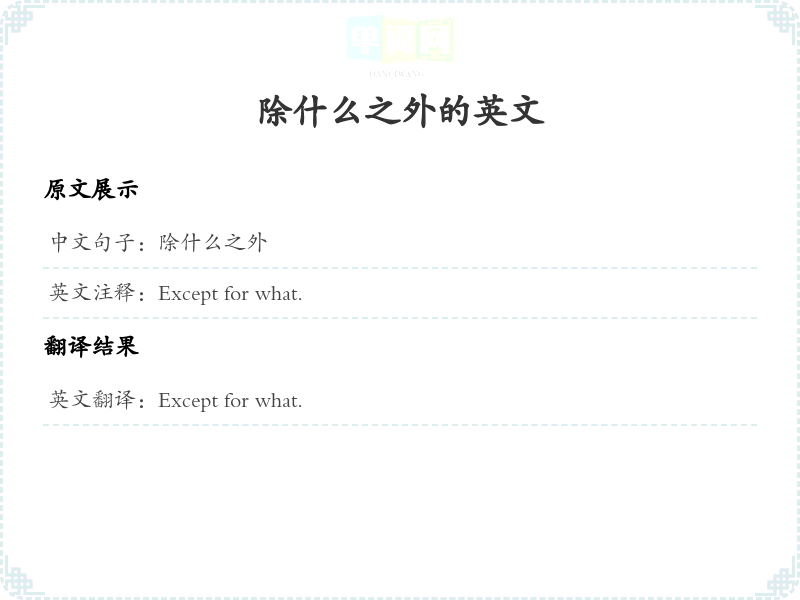 - 在翻译过程中,保持了原句的简洁性和明确性。'除'表示排除,'什么'指代不确定的事物,'之外'表示范围外。因此,整体意思为排除某个范围以外的东西。