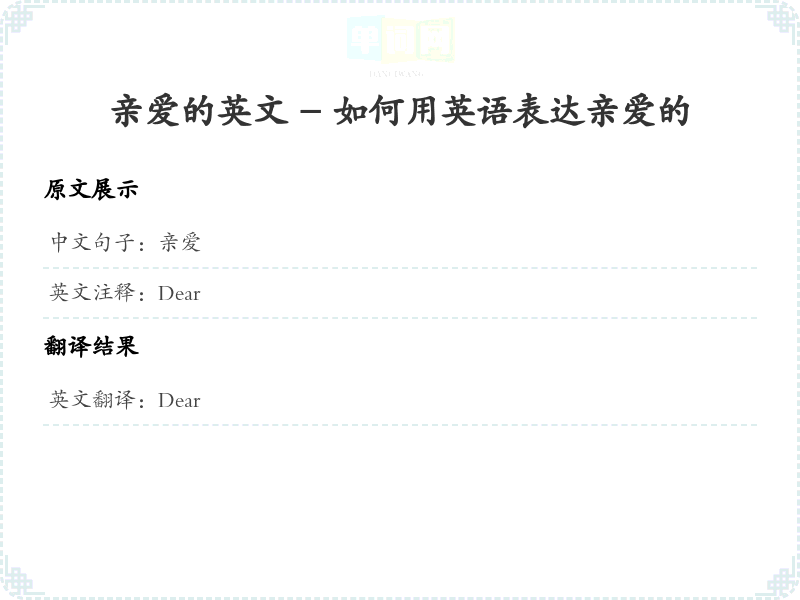 通过本篇文章的学习,希望你能够对"亲爱"这个词的翻译及相关用法有一个全面的理解,并在实际应用中灵活运用。