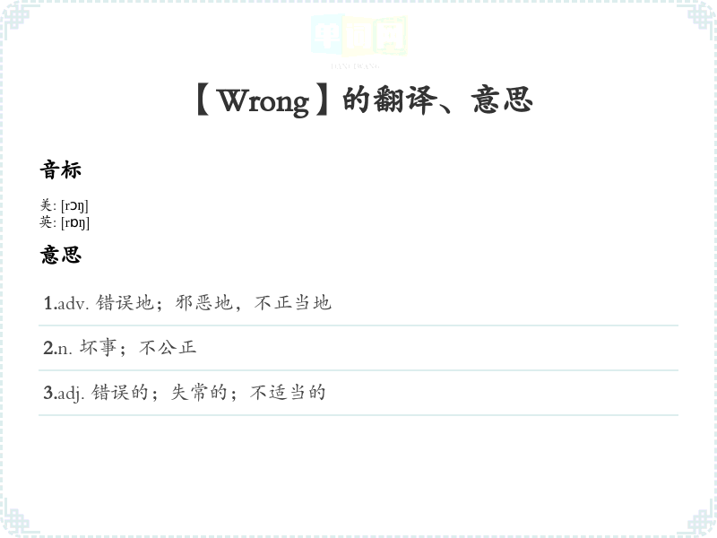 - 字面意思: "Wrong"字面意思是“错误的”或“不正确的”。其清晰的定义为:不符合事实、真理或合适标准的事物。
