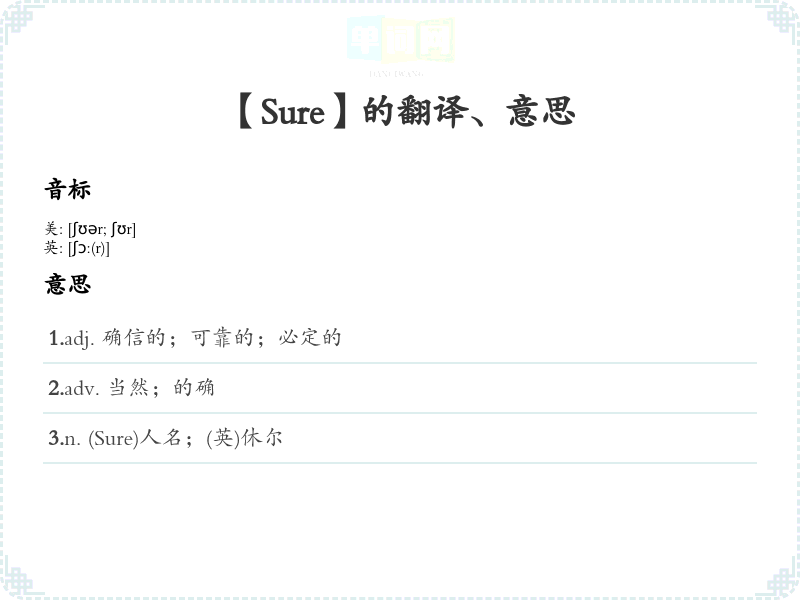 “Sure”源自法语“sûr”,而法语的“sûr”又源自拉丁语“sicurus”,意思是“安全的,确实的”。词根“sucur”意为“无忧的,放心的”。 -