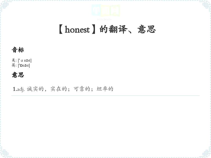 - “honest”源自拉丁语“honestus”,意为“荣誉的、体面的”,由词根“honor”演变而来,表示与荣誉和道德相关的特质。