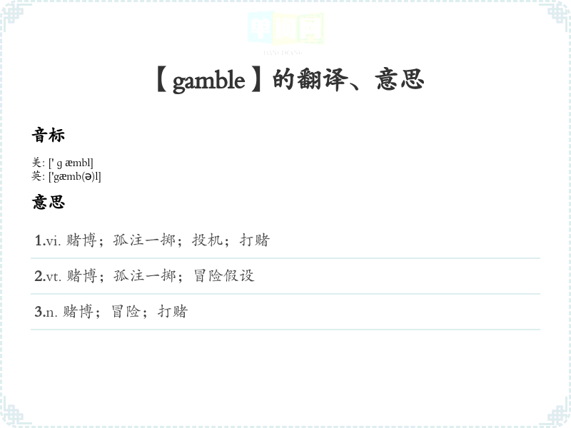 - 字面意思:Gamble的字面意思是“冒险”,通常指在不确定的情况下进行某种投资或决策,特别是与金钱相关的活动。