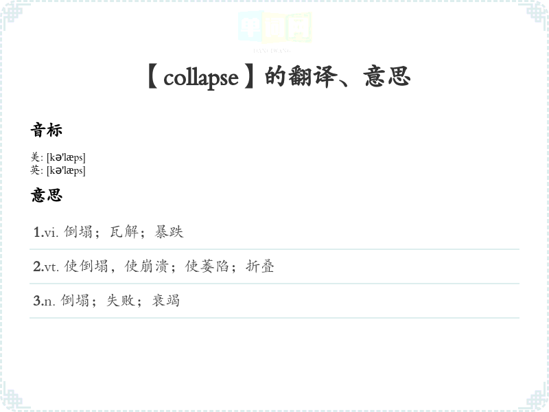 2.vt. 使倒塌,使崩溃;使萎陷;折叠 3.n. 倒塌;失败;衰竭