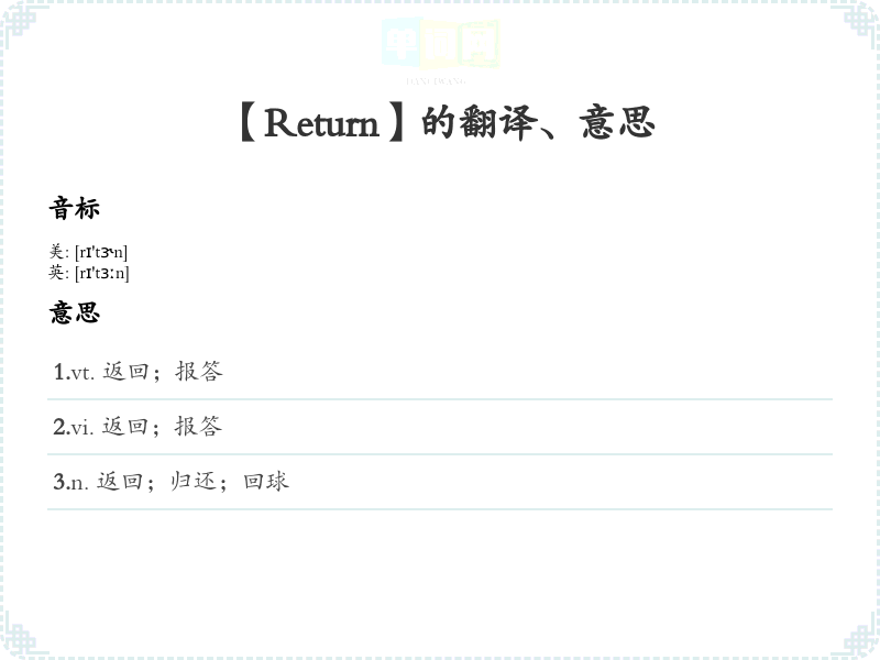 3.n. 返回;归还;回球 4.adj. 报答的;回程的;返回的