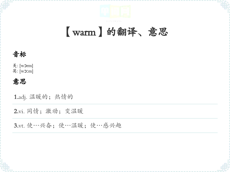 通过这些分析和示例,希望能够帮助你更好地理解和记忆单词 "warm"。