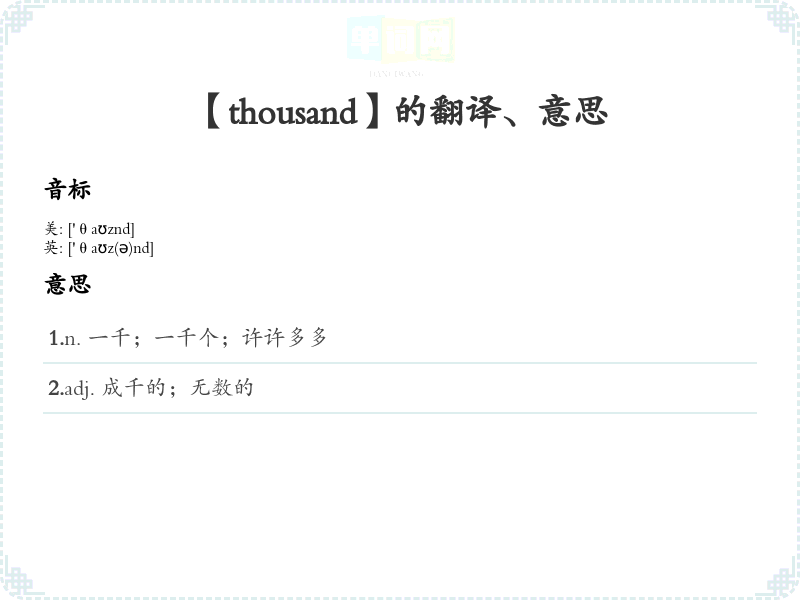 1.n. 一千;一千个;许许多多 2.adj. 成千的;无数的