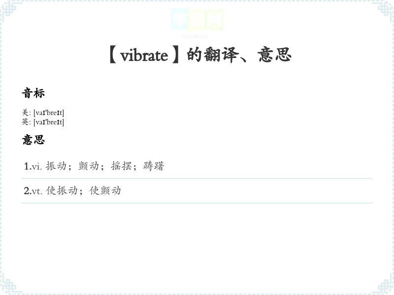 - 可以通过分解音节“vi-brate”来记忆。可以联想“vibe”(气氛)与“rate”(速率)结合,想象音乐的气氛如何影响我们的情绪。