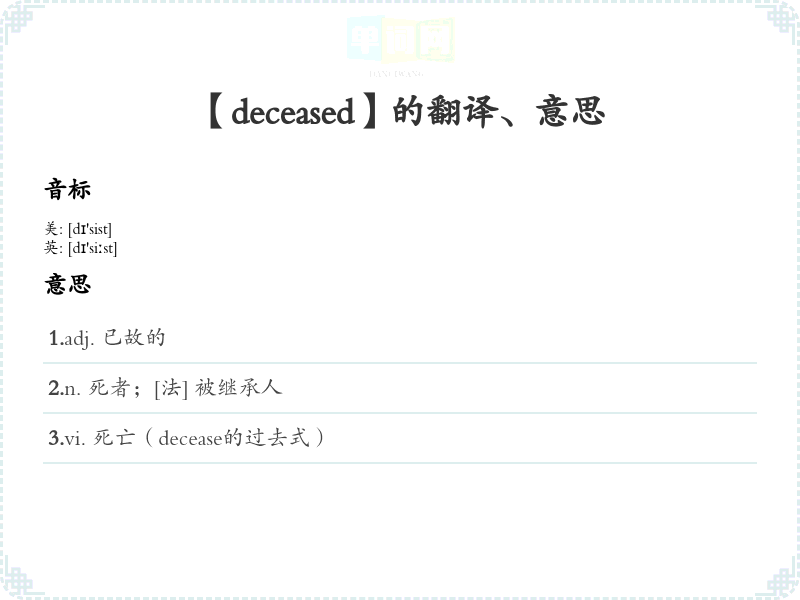 - 字面意思: "Deceased" 是一个形容词,字面意思是“死去的”,用以描述已经去世的人或事物。
