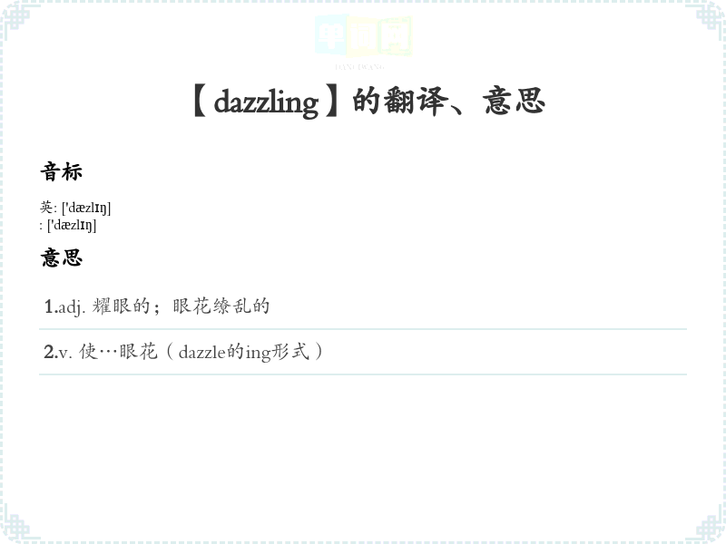 - 音标记忆法:dazzling 的音标为 /ˈdæzlɪŋ/,可以通过分解音节来记忆,强调“dazz”和“ling”的发音。