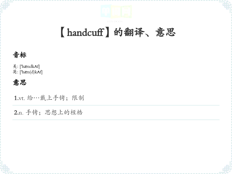 - 字面意思:handcuff(手铐)是将两个手腕固定在一起的装置,通常用于限制某人的活动,特别是执法人员在逮捕时使用。