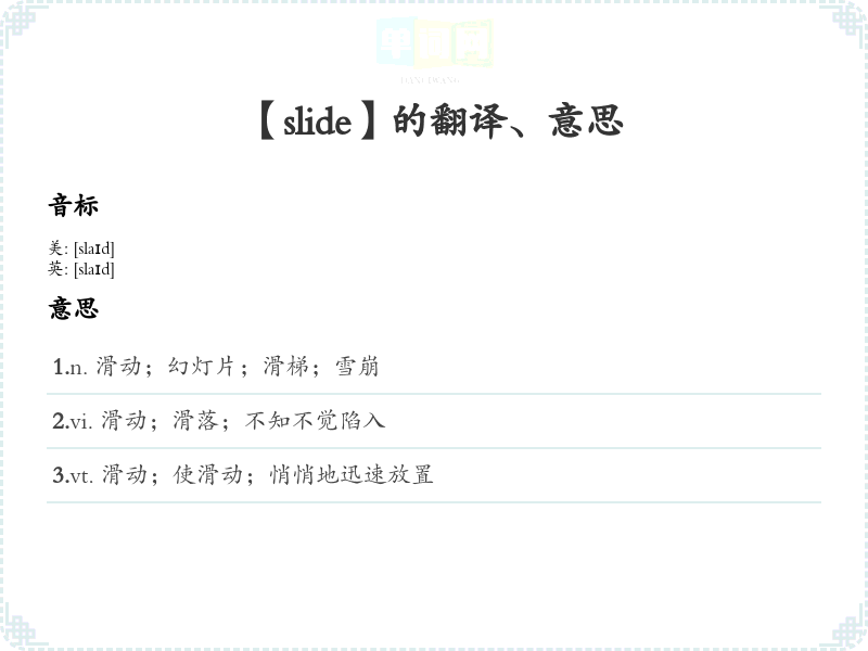 2.vi. 滑动;滑落;不知不觉陷入 3.vt. 滑动;使滑动;悄悄地迅速放置