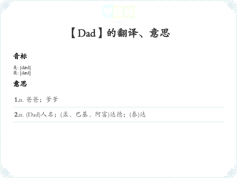 - 音标记忆法:Dad 的音标为 /dæd/,可以通过发音练*和重复来加深记忆。在发音时,注意口型和舌位,可以和“bad”进行对比。